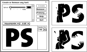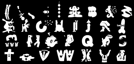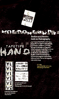 FUSE 11 has pornography as theme. You animate letters to illustrations by moving the slider in FontCreator. Fontcreator is built into Adobe Illustrator and QuarkXPress (Xtension) and also in the latest versions of Adobe Type Manager. In November 1996 Luc(as) was invited to show his porno font and illustrations in the German television program "Liebe Sünde". MultipleMaster fonts contain two or more extremes. One extreme is a serious typeface, TheSans Black. The other extreme are more or less pornographic illustrations, based on the colourfull drawings in my sketchbooks. |